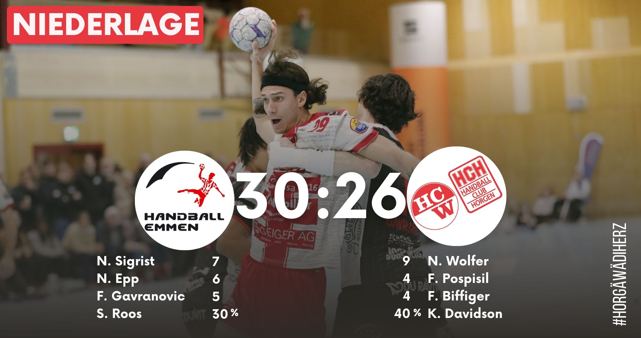In den ersten 30 Minuten zeigte sich ein deutliches Kräfteverhältnis zugunsten der Emmener, die ihre Gäste klar dominierten. Hinzu kam, dass die Torhüter der SG wenig Glück hatten und bis zur Pause nur einen von 21 Würfen aufs Tor abwehren konnten. In der zweiten Halbzeit konnte die SG Wädenswil/Horgen die Partie mit 15:10 für sich entscheiden, doch zu mehr als einer Ergebniskosmetik beim Endstand von 30:26 reichte es nicht. Immer wieder war es Emmens Topscorer Sigrist, der mit insgesamt sieben Treffern den Lauf der Gäste unterbrach.