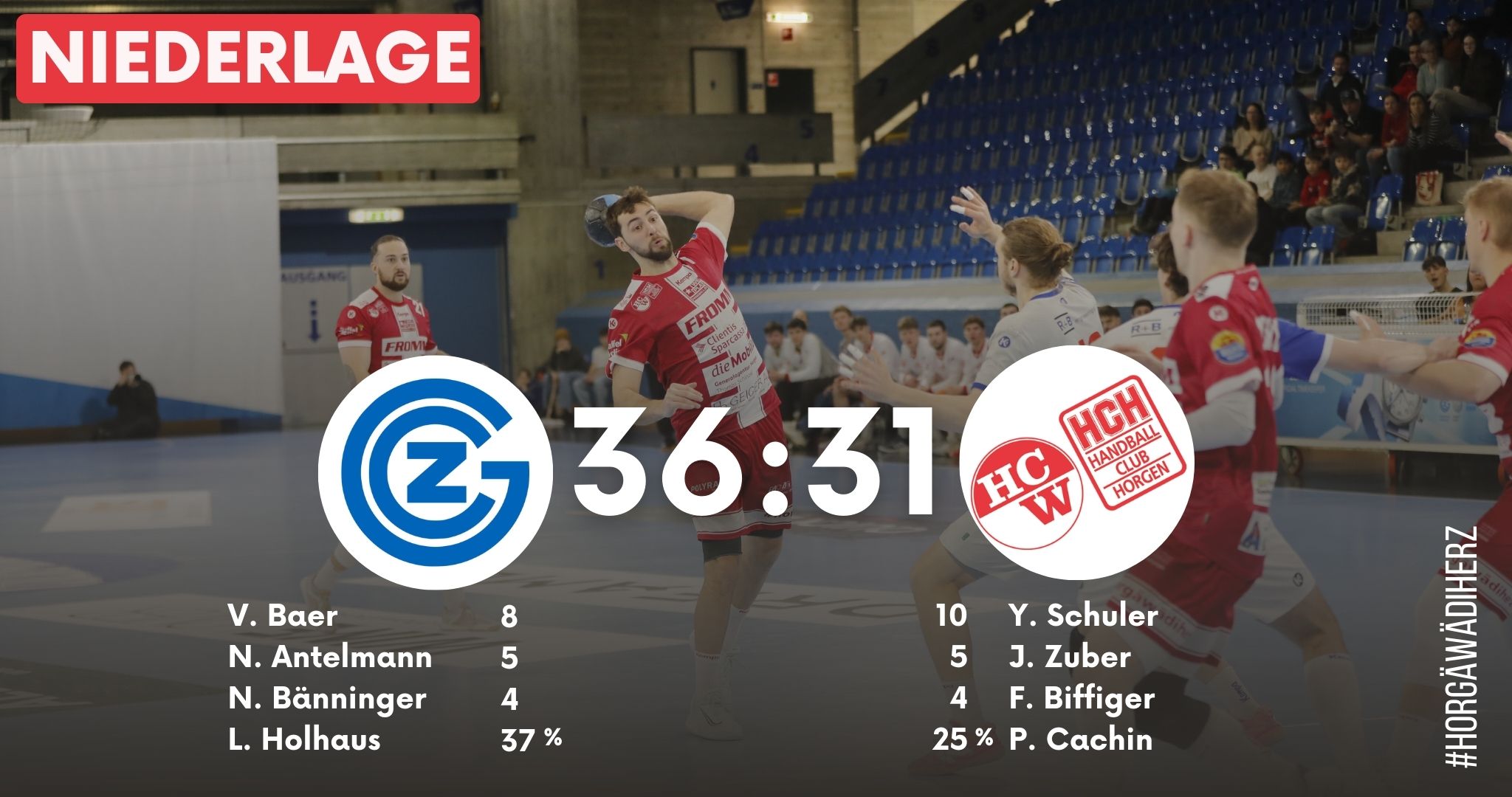 SG Wädenswil Horgen: Cachin 1-42, (7P/25%), Sokcevic (4P/25%), Döbbeling (1), Pospisil, Stirnimann (2), Biffiger (4), Zollinger (1), Buob (1), Kuzma (3), Burherr, Davidson, Schuler (10/1), Pfister (3), Zuber (5/1), Wolfer (1), Rehmann.