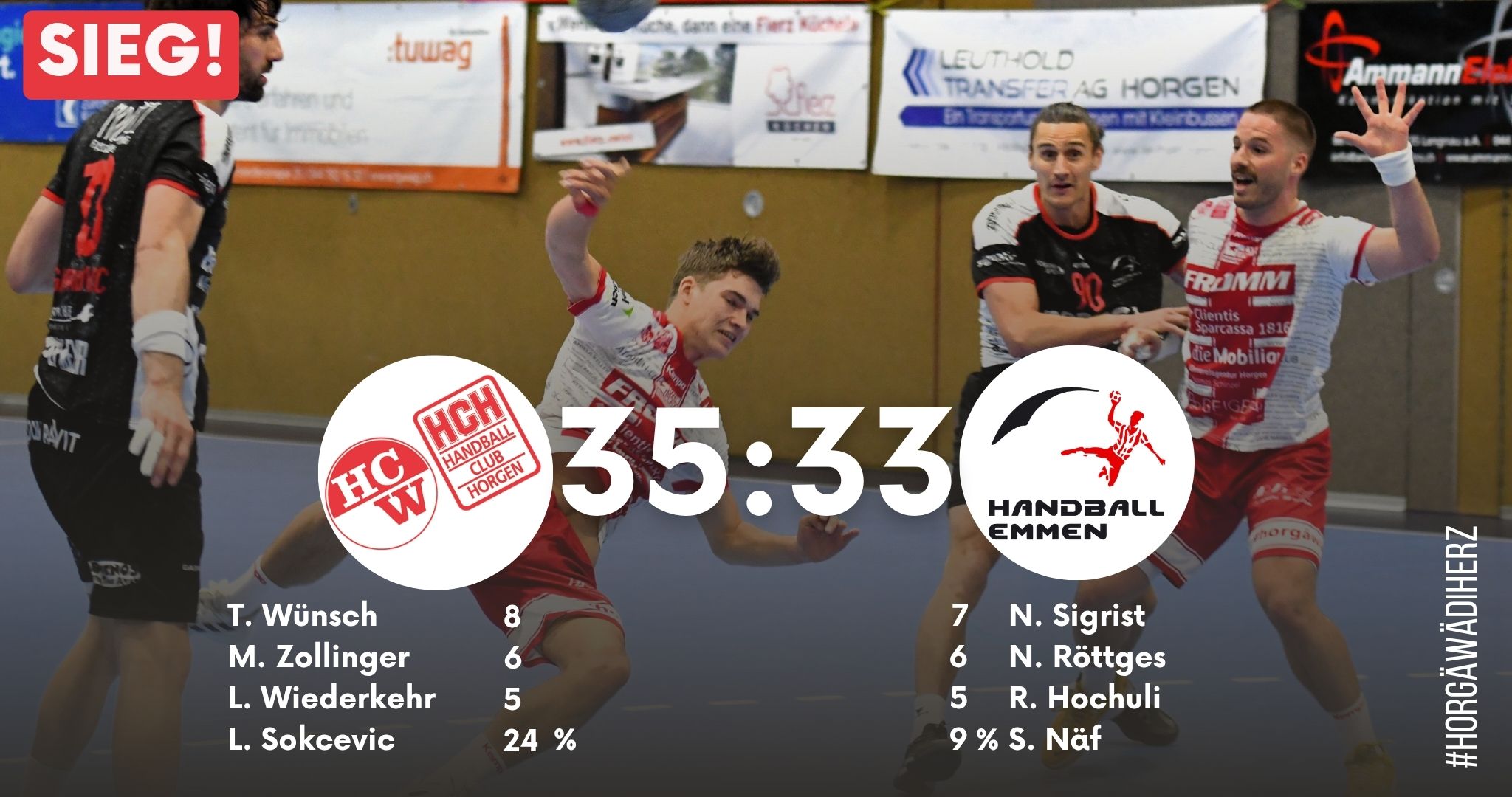 Bereits sechs Minuten nach Wiederanpfiff gelang es Nico Wolfer das Geschehen erstmals auszugleichen. Neuzugang Lino Wiederkehr erzielte in der 52. Minute mit seinem zweiten Treffer die erstmalige Führung und leitete damit die entscheidende Phase ein. Wolfer, Wiederkehr und Wünsch, der acht Tore zum Erfolg beisteuerte, hielten die Gäste in der Schlussphase auf Distanz und sicherten dem Heimteam den 35 : 33 Sieg gegen den Tabellenführer Handball Emmen.